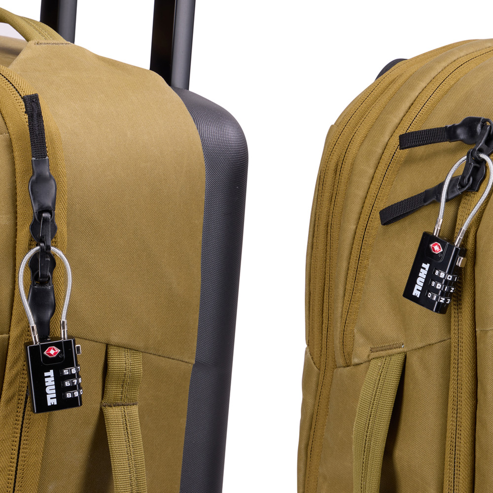 Разработанный для спокойствия владельца багажа замок Thule TSA Cable Lock позволяет сотрудникам TSA (Администрация транспортной безопасности) проверять багаж на любом этапе перелета без присутствия владельца, избегая повреждений и одновременно защищая вещи от нежелательного доступа. От обычного кодового замка замок TSA отличается наличием скважины под специальный ключ и значком в виде красного ромба — эмблемы системы. Чемодан, как и обычно, закрывается на кодовый замок, комбинация которого известна только владельцу. При этом, сотрудники спецслужб без труда смогут открыть багаж с помощью специального ключа. Комбинация кодового замка остается нетронутой.