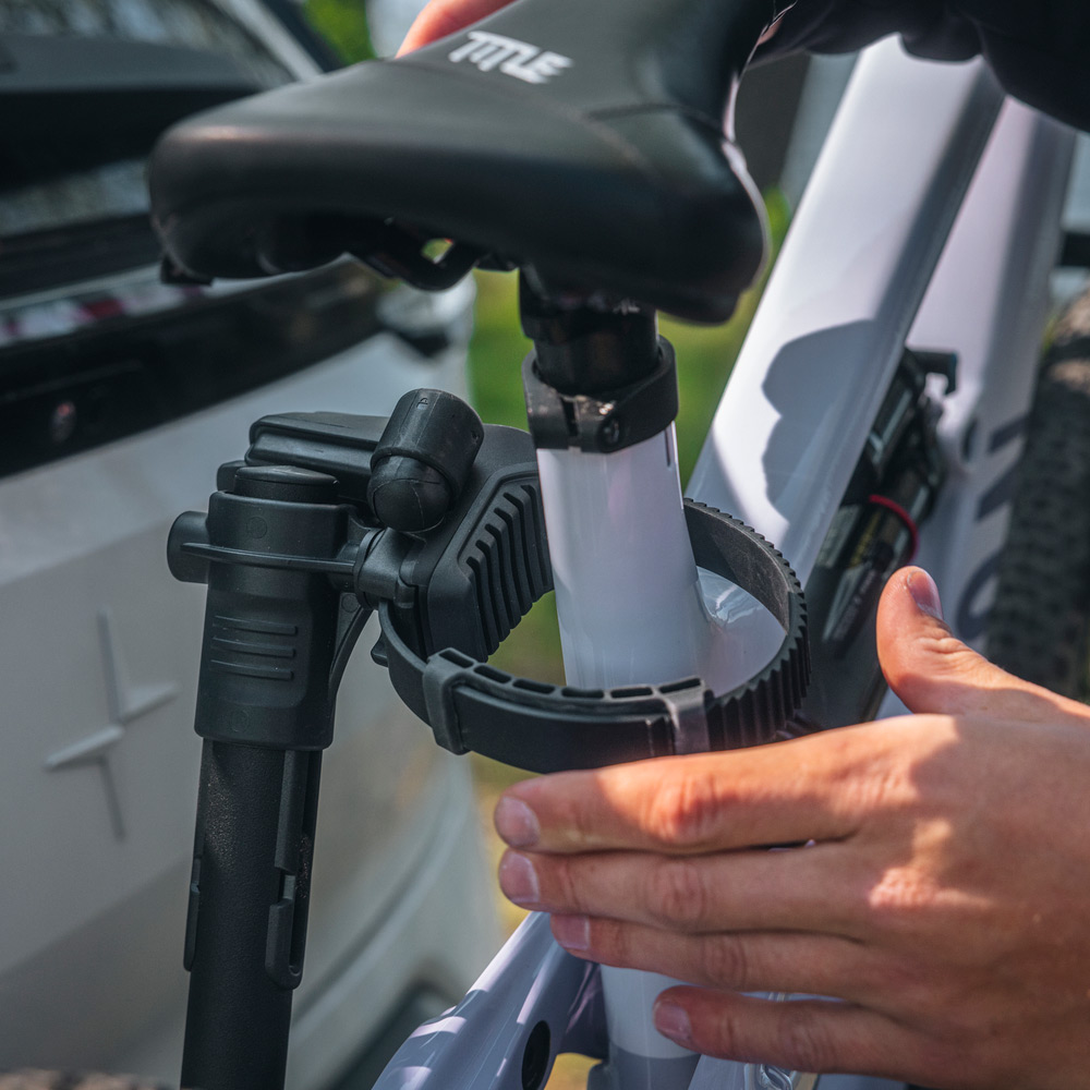 Храповые пряжки и ремешки для колес надежно фиксируют шин диаметром до 3". Ремешки аккуратно убираются в специальное место для хранения при загрузке велосипедов.